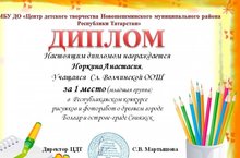По итогам конкурса дипломом 1 степени в номинации «Рисунок» награждены обучающиеся 2 и 8 класса Норкина Анастасия и Репин Денис. Поздравляем!