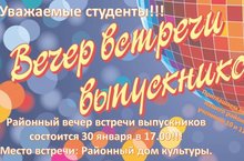 Вечер встречи выпускников состоится 30 января в 17.00 в РДК!Школа приглашает своих выпускников, а также 10 и 11 классы. -