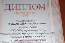 22 мая 2017 года Киселева Т.Л. приняли участие в очном этапе конкурса по поддержке учителей химии Республики Татарстан «Все грани химии» в рамках Х республиканской научно – методической конференции педагогов общеобразовательных учреждений, преподавателей учреждений среднего и высшего профессионального образования «Система «взращивания» одаренных школьников: методологические аспект и практика» г. Казани. Татьяна Леонидовна награждена дипломом за 1 место в номинации «Урок», в которой 39 участников представили свои работы. Надо заметить, что два года назад также участвовала в данном конкурсе в номинации «Урок», получив сертификат участния. Спустя год, зная критерии и отточив мастерство, Киселева Т.Л. стала призером в этой же номинации, а в этом году – победителем. 30.05.2017