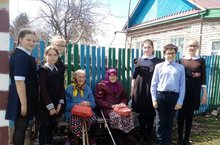 Накануне праздника Дня Победы ученики 8 класса посетили труженицу тыла Баранову К.М.. Хозяйка радушно встретила ребят, рассказала о жизни в годы войны, кем работала. Ребята прикрепила к груди Клавдии Михайловны ленточку и подарили цветы.