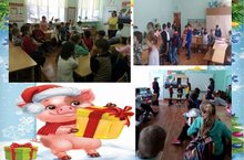 Праздник начался весёлой музыкой. Много разных приключений, чудес и испытаний прошли герои вместе с детьми. На праздник прибыли настоящие Дед Мороз и Снегурочка! Учащиеся порадовали присутствующих прекрасными песнями, стихами и играми. Дед Мороз и Снегурочка вручили каждому участнику праздника новогодние подарки. Доброго вам здоровья, благополучия! Пусть год Свинки принесет вам удачу в Новом году!