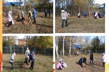 Сегодня ученики с учителями дружно вышли на субботник. Убирали территорию от листьев и мусора.