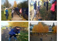 Сегодня все 4 классы с учителями дружно вышли на субботник. Убирали территорию от листьев и мусора.