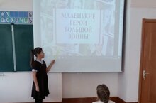 Сегодня с учащимися 1-3 классов была проведена беседа на тему "Маленький солдат Великой войны". Целями беседы были: воспитывать чувство патриотизма,гордость за свою страну,уважения к историческому боевому пути славной Родины,углублять знания учащихся о ВОВ ,героизме народа-освободителя, рассказать о детях,участвовавших в ВОВ наравне с взрослыми ,воспитывать уважительное отношение к людям старшего поколения,к ветеранам.