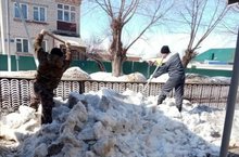 Субботник на территории школы-детского сада. На территории учреждения и на закрепленных участках раскидывали снег, очищали отмоски, лед, подметали очищенные дорожки.