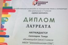 Яңа Чишмә районы Шахмай урта гомуми белем биру мәктәбенең 5 нче сыйныф укучысы Саттаров Тимур,"Әдәби марафон"дип исемләнгән татар теле һәм әдәбиятынан Республика олимпиадасында диплом белән бүләкләнә.