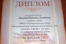 «Все грани химии» 23.05.2017 22 мая 2017 года Сабанаева Н. А. и Киселева Т.Л. в ФГБОУ ВО «КНИТУ» приняли участие в очном этапе конкурса по поддержке учителей химии Республики Татарстан «Все грани химии» в рамках Х республиканской научно – методической конференции педагогов общеобразовательных учреждений, преподавателей учреждений среднего и высшего профессионального образования «Система «взращивания» одаренных школьников: методологические аспект и практика». Нафиса Арифовна получила сертификат участника в номинации «Внеклассное мероприятие», где было представлено 19 работ. Татьяна Леонидовна награждена дипломом за 1 место в номинации «Урок», в которой 39 участников представили свои работы. Надо заметить, что данные учителя два года назад также участвовали в данном конкурсе в номинации «Урок» в г.Казань: Сабанаева Н.А. – призер, Киселева Т.Л. – участница. Спустя год, зная критерии и отточив мастерство, Киселева Т.Л. стала призером в этой же номинации, а в этом году – победителем. Наши участницы желают учителям химии района принимать участие в республиканском конкурсе «Все грани химии».