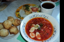 Сегодня в нашей школе прошел день Национальной кухни. Мы готовились к нему заранее. Фойе первого этажа и столовая были оформлены в украинском стиле. С самого утра настроение школьников и педколлектива было праздничным. По всей школе распространился очень вкусный, будоражащий воображение аромат. Повара в очередной раз порадовали нас своими кулинарными способностями: приготовили отменный борщ с галушками, лежни картофельные со свежими огурцами и помидорами, компот с помпушками. Все было так вкусно!!!! Стены столовой были украшены старинными вышитыми салфетками, плакатами с изображением украинских национальных блюд. В фойе размещен приветственный плакат со словами "Ласково просимо!, что на русском языке означает "Добро пожаловать!, а перед входом в столовую плакат с изображением "Приемного апетиту!" - по русски -"Приятного аппетита!". Гостей у входа встречали наши ученицы, одетые в украинские народные одежды, рассказали об особенностях украинской кухни, станцевали украинский танец, предложили (на украинском языке) отведать каравай, и испить кваса.