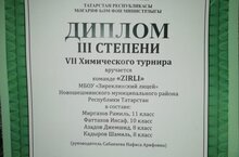 Учащиеся лицея участвовали в 7-ом республиканском Химическом турнире и заняли 3 место. Молодцы,ребята! Командир Миргазов Рамиль,ученик 11 класса, награжден дипломом "Лучший оппонент". Руководитель: учитель химии Сабанаева Н.А.