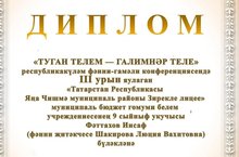 Ученик 9 класса Фаттахов Инсаф занял 3 место в научно - исследовательской конференции "Туган телем - галимнәр теле". Поздравляем.