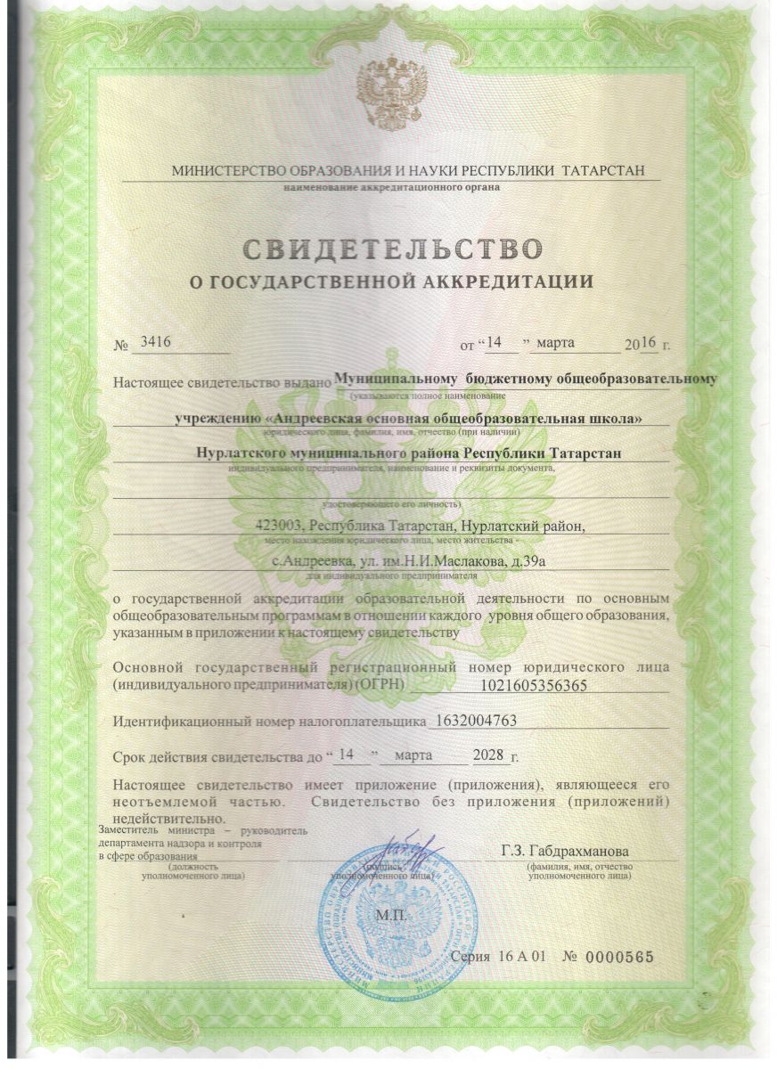 Муниципальное бюджетное общеобразовательное учреждение "Андреевская основная общеобразовательная школа " Нурлатского муниципального района Республики Татарстан (Татарстан Республикасы Нурлат муниципаль районы "Андреевка төп гомуми белем мәктәбе" муниципаль бюджет гомуми белем учреждениесе)