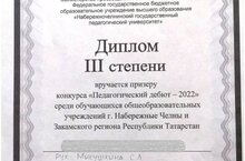 Поздравляем обучающуюся 8 класса с призовым местом в конкурсе "Педагогический дебют-2022" среди обучающихся общеобразовательных учреждений г.Набережные Челны и Закамского региона РТ. Руководитель Микушкина С.Л.