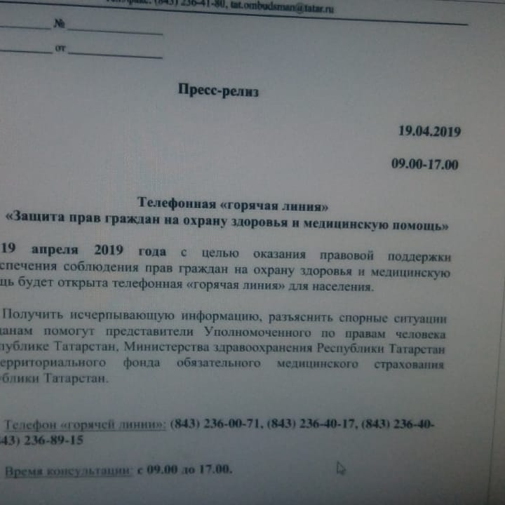 Телефонная "горячая линия" "Защита прав граждан на охрану здоровья и медицинскую помощь" 19 апреля 2019 года с 9.00 до 17.00 часов.