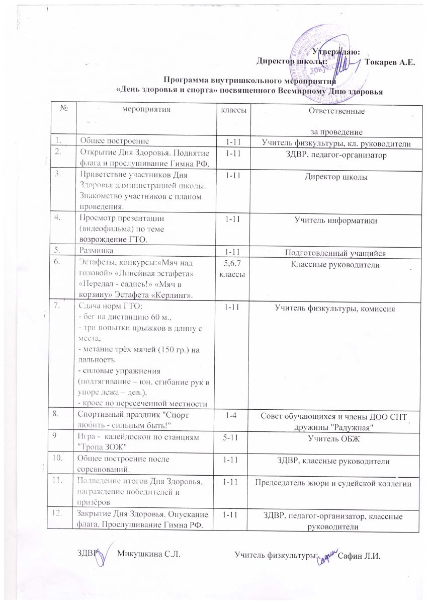 Программа внутришкольного мероприятия "День здоровья и спорта", посвященного Всемирному Дню здоровья