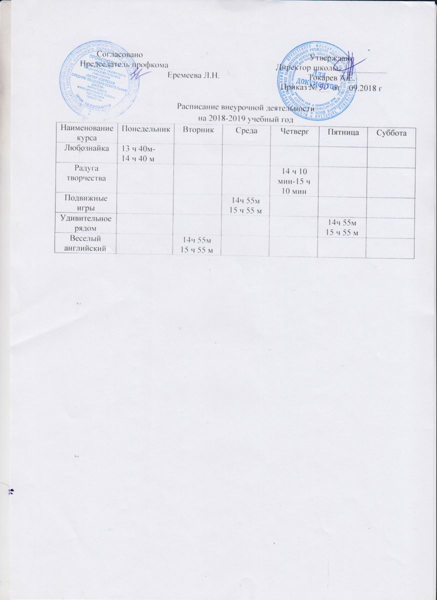 Расписание внеурочных занятий МБОУ "Биляр-Озерская СОШ" / МБГБУ "Биләр-Күле урта гомуми белем мәктәбе"нең дәрестән тыш расписаниесе