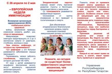 Управление Роспотребнадзора по Республике Татарстан информирует Вас о том, что по инициативе Всемирной организации здравоохранения в Европе, в том числе в Российской Федерации и в Республике Татар-стан в период с 26 апреля 2 мая 2021 года проводится Европейская неделя имму-низации . Основная цель ЕНИ-2021 - повышение уровня знаний населения о значении вакцинации.