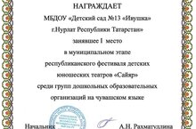Наши воспитанники принимали участие в муниципальном этапе республиканского фестиваля детских юношеских театров "Сайяр" и заняли 1 место среди групп дошкольных образовательных организаций с постановкой на родном (чувашском) языке.