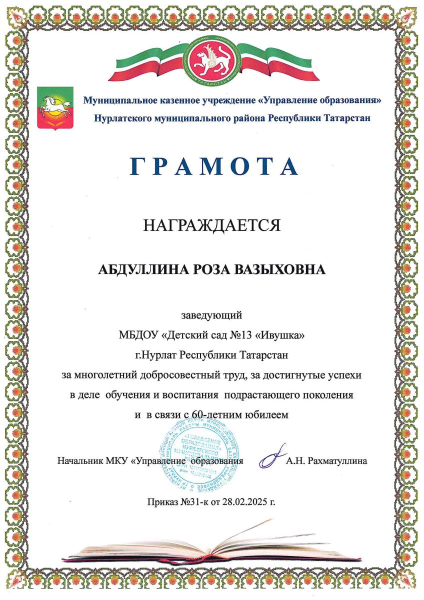 Грамота МКУ "Управление образования" Нурлатского муниципального района Абдуллина Роза Вазыховна.
