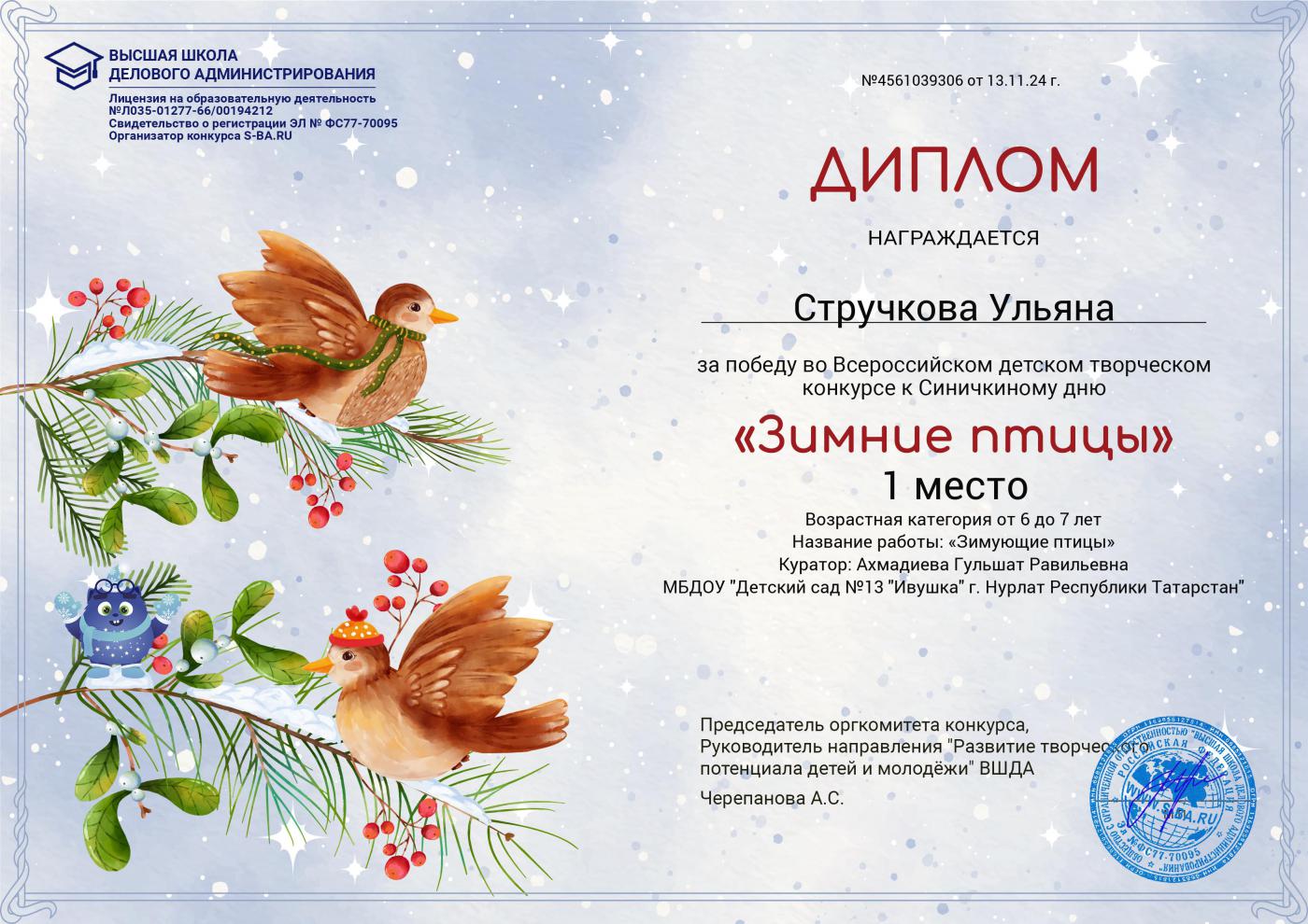 Диплом 1 место. Всероссийский детский творческий конкурс к Синичкиному дню