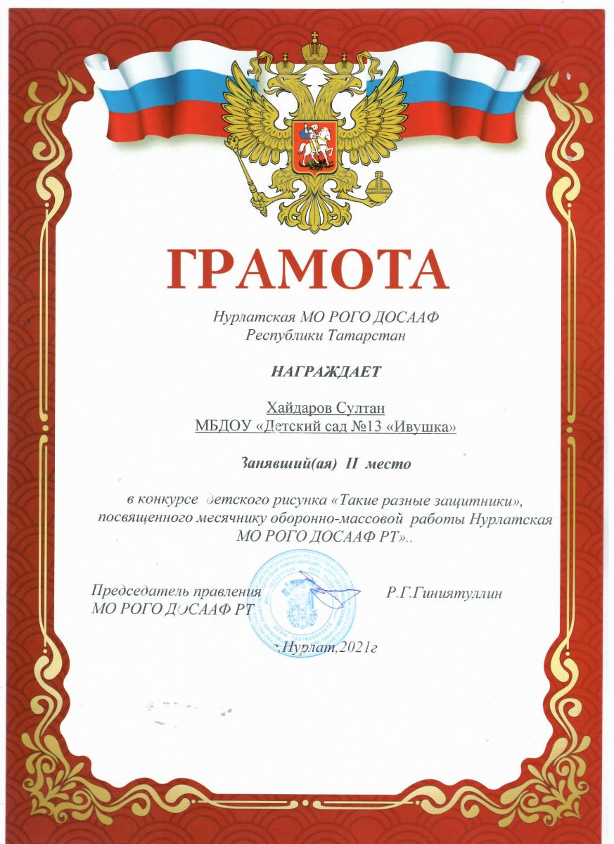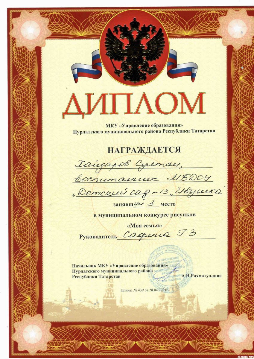 Диплом 3 место Муниципальный конкурс рисунков "Моя семья" Хайдаров Султан