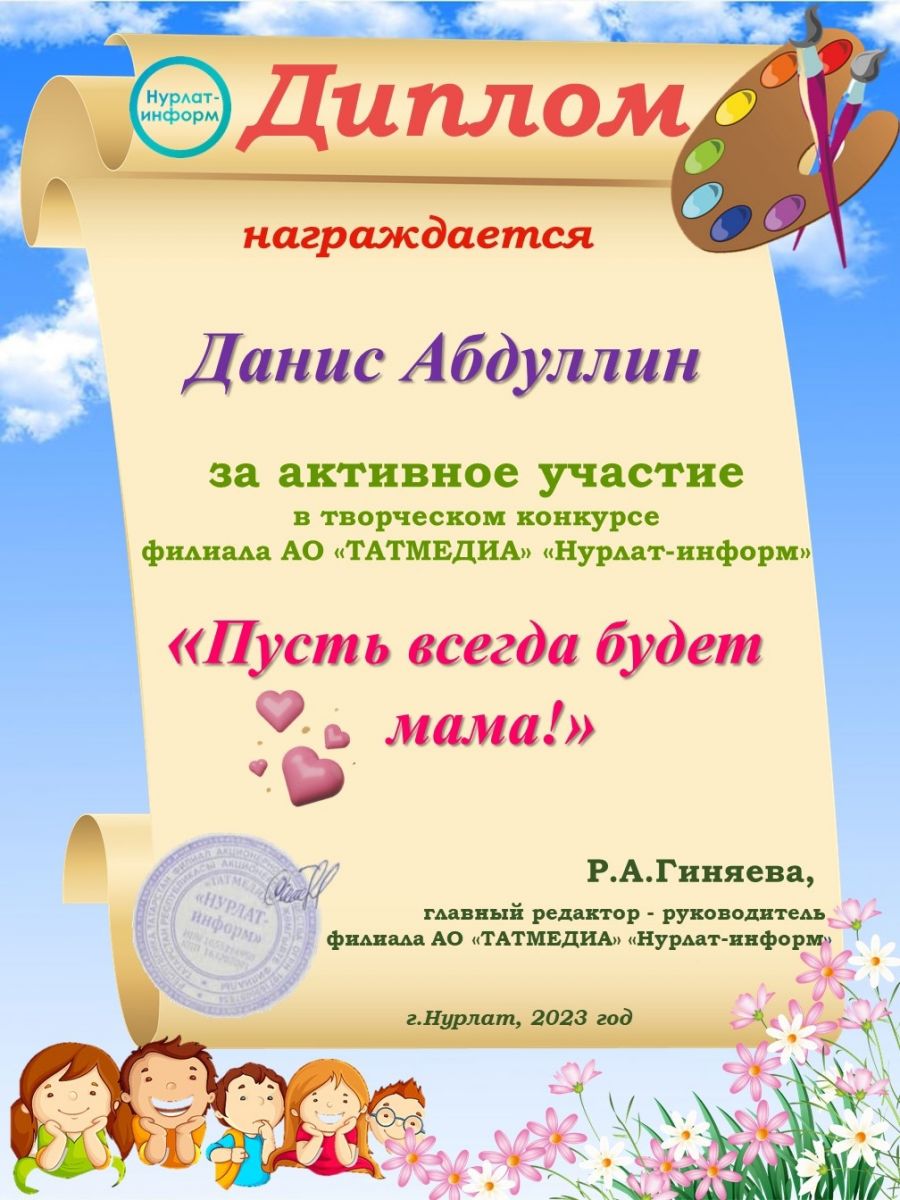 Диплом в творческом конкурсе филиала АО "Татмедиа" "Нурлат-Информ" Данис А.