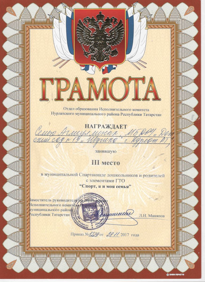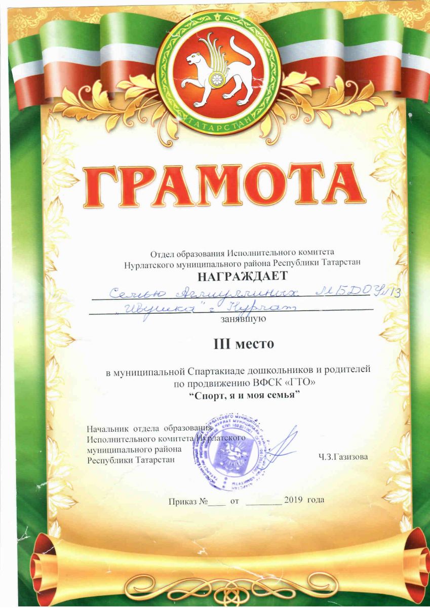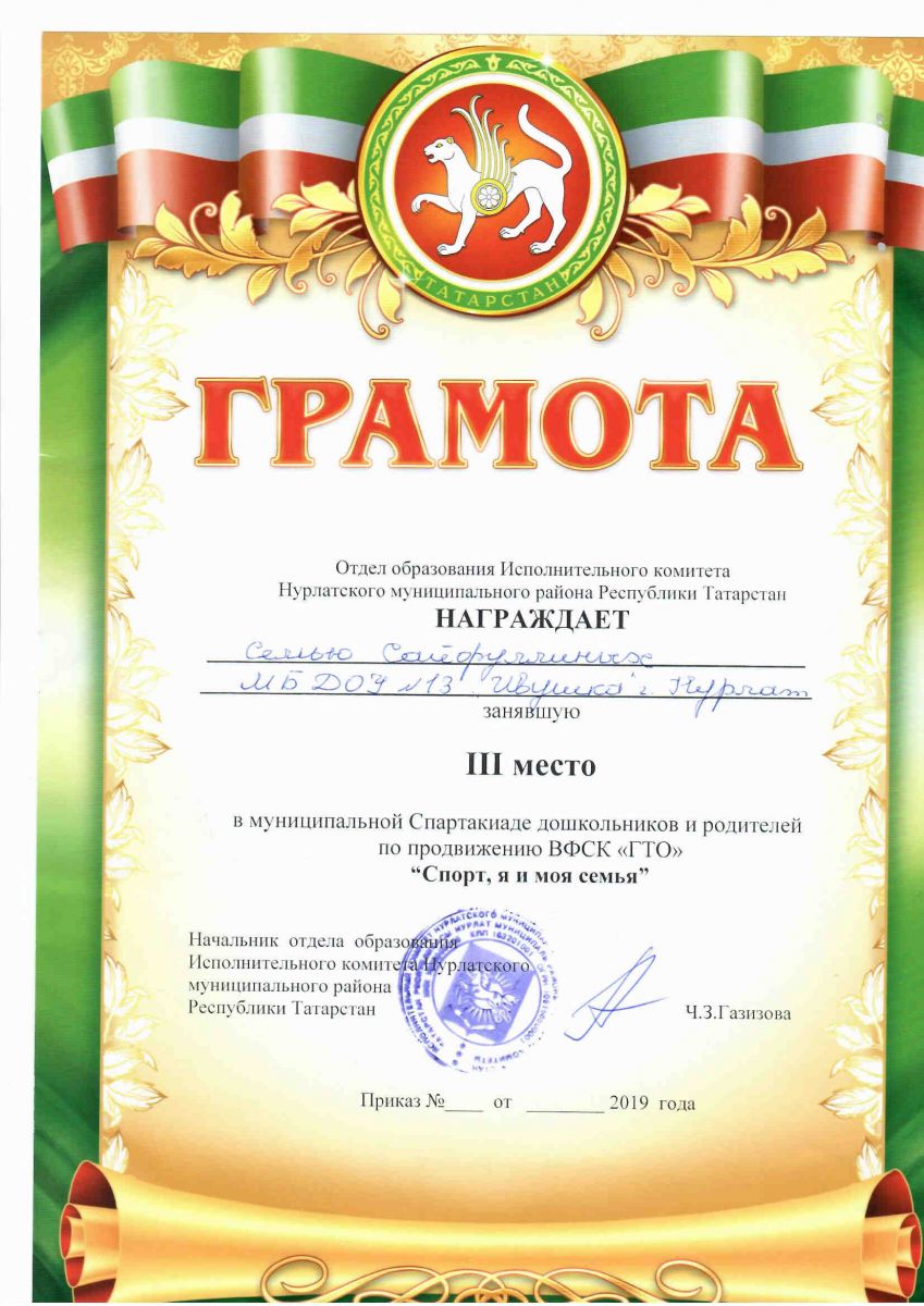Грамота 3 место. Семья Сайфуллиных. "Спорт я и моя семья"