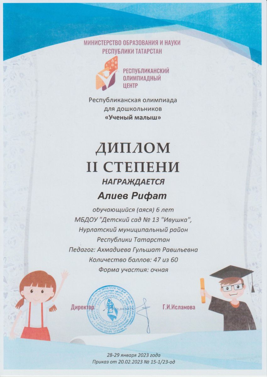 Диплом 2 степени в Республиканской олимпиаде для дошкольников "Ученый малыш" Рифат А.