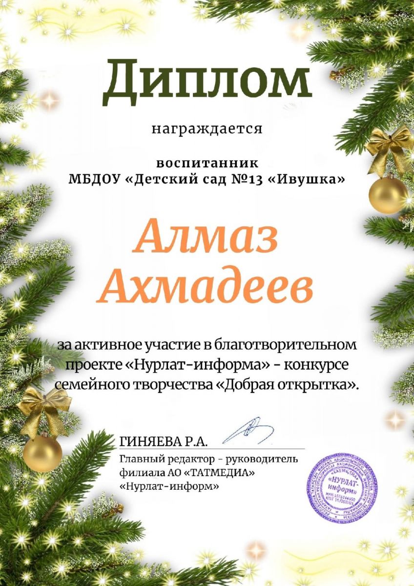 Диплом за активное участие в конкурсе семейного творчества "Добрая открытка" Алмаз А.