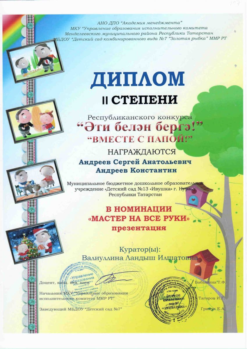 Диплом 2 степени Республиканского конкурса "Вместе с папой" Андреев Константин