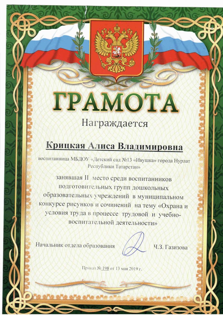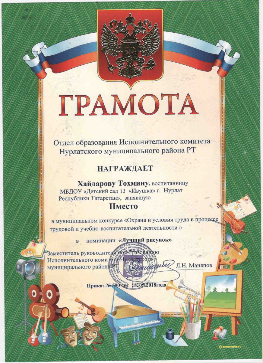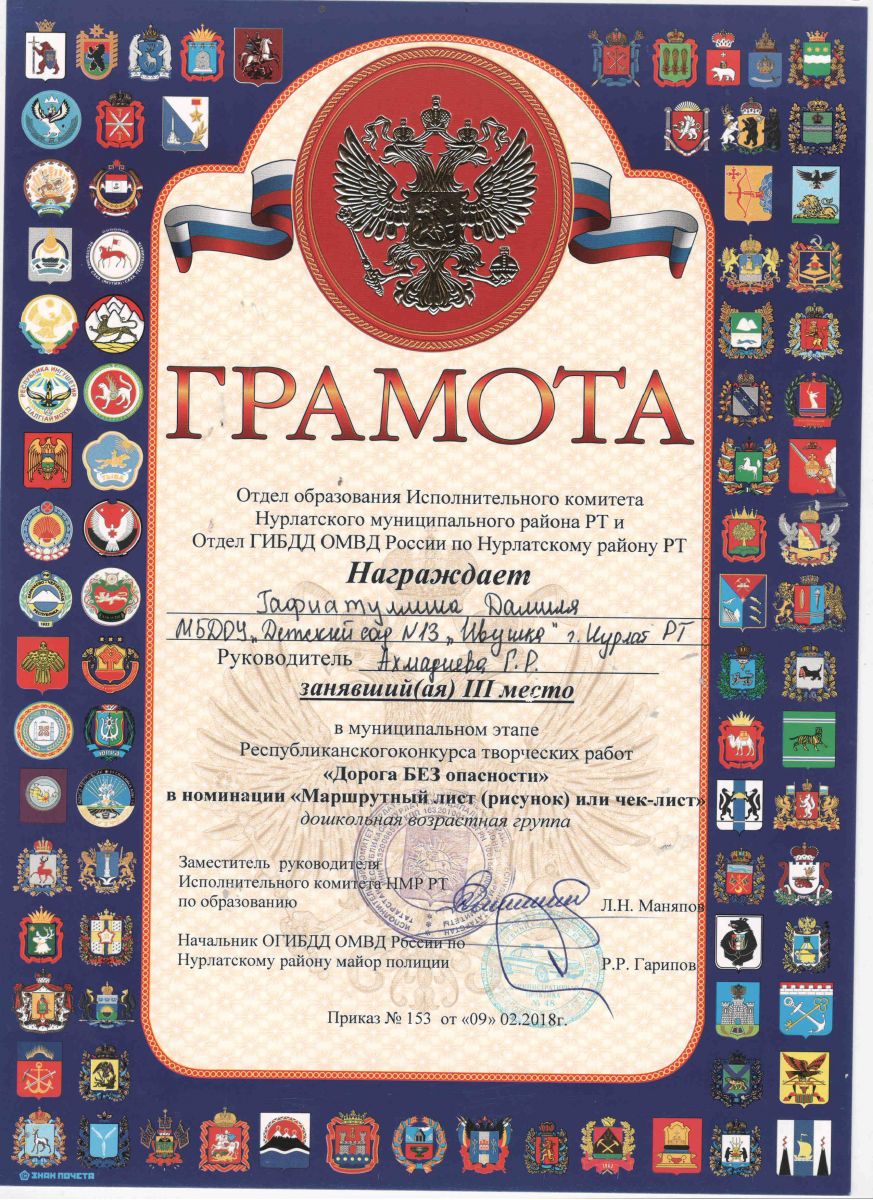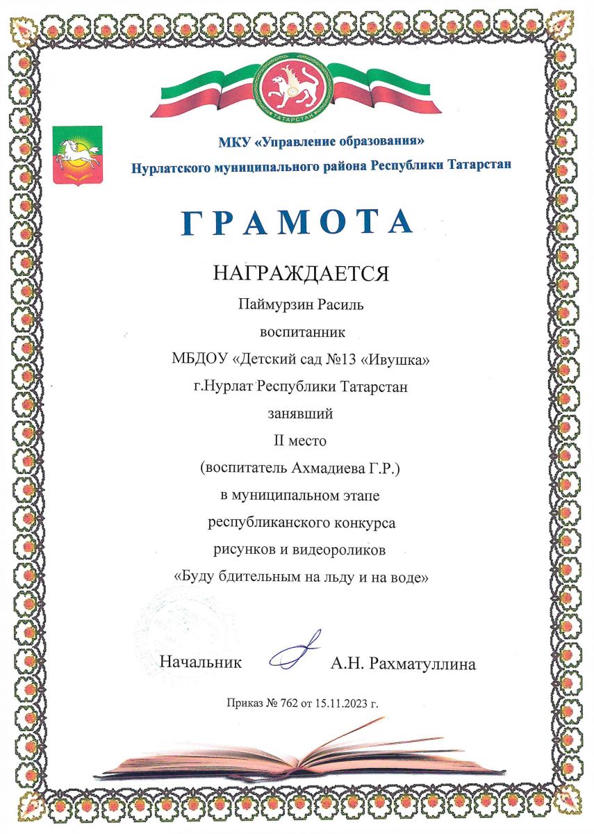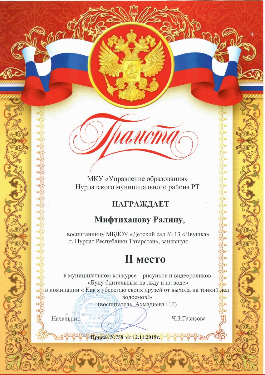 Грамота 2 место Мифтиханова Ралина. Муниципальный конкурс "Буду бдителҗным на лҗду и на воде"