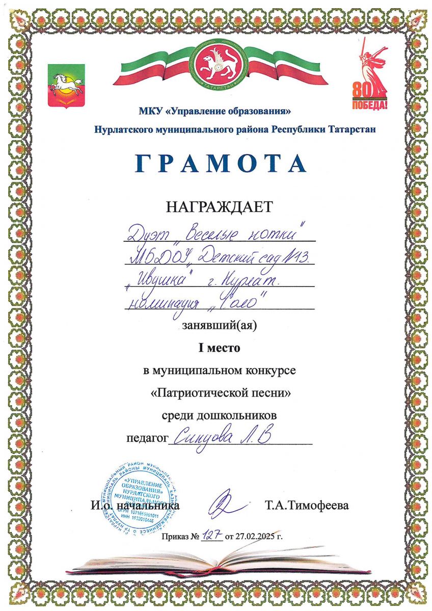 Грамота 1 место в муниципальном конкурсе "Патриотичекской песни"