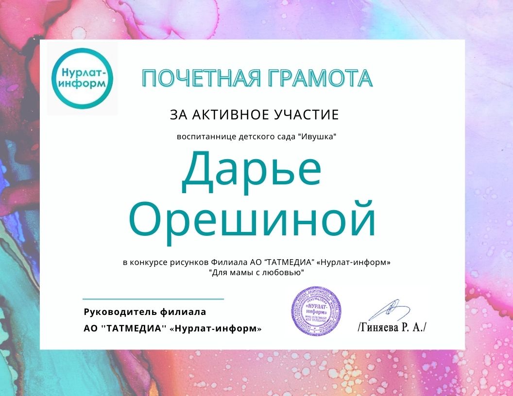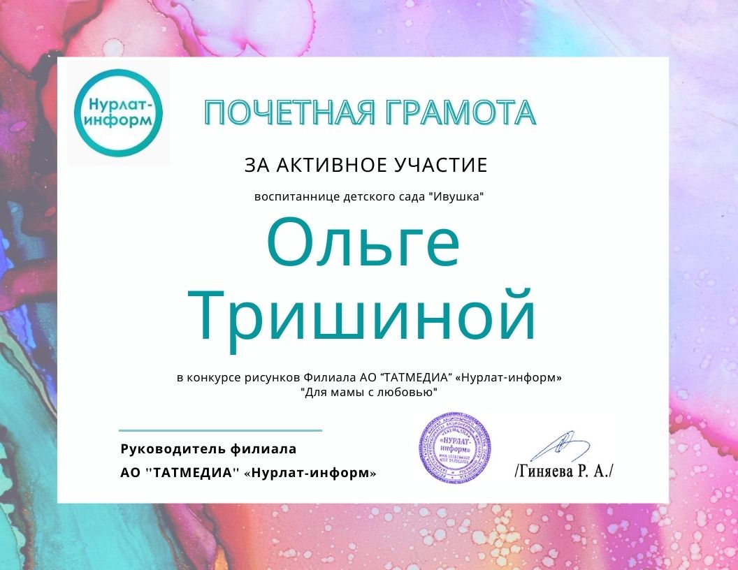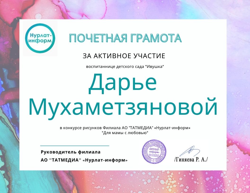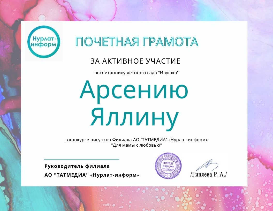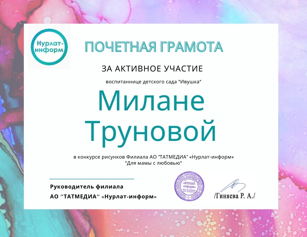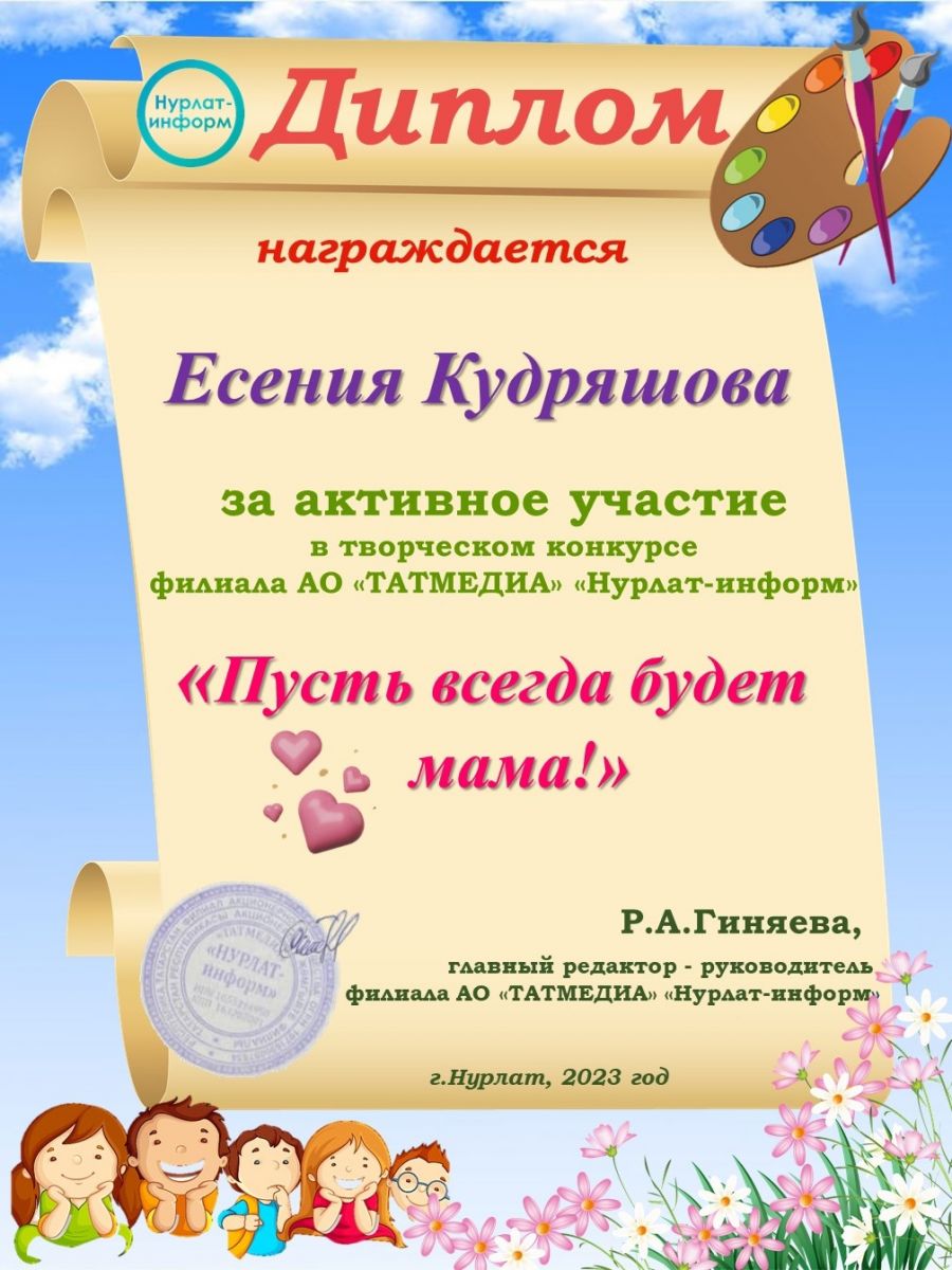 Диплом в творческом конкурсе филиала АО "Татмедиа" "Нурлат-Информ" Есения К.