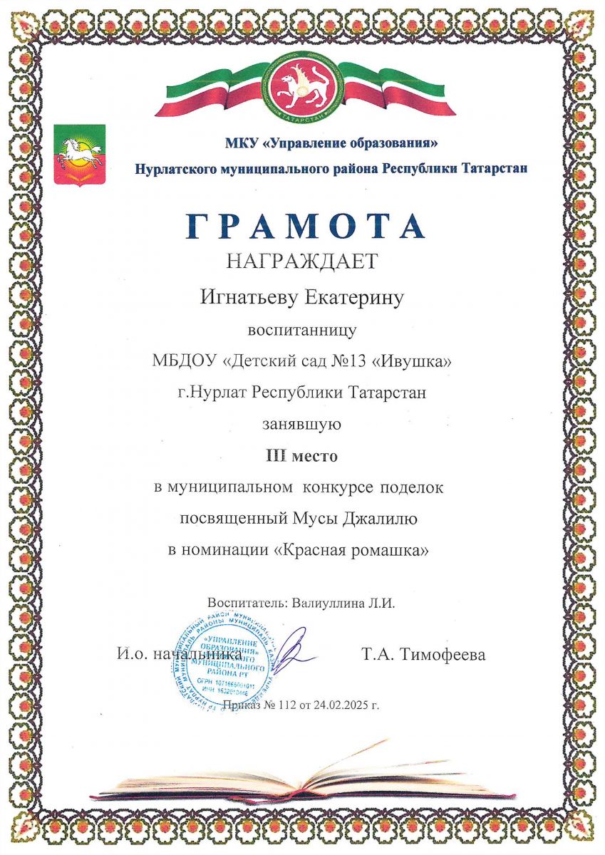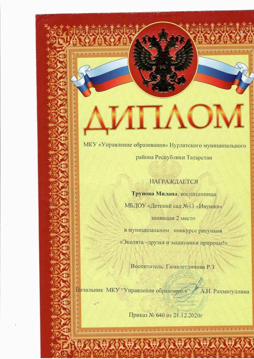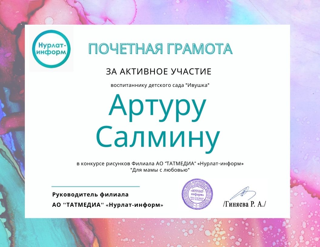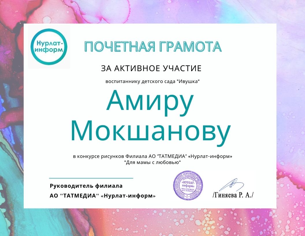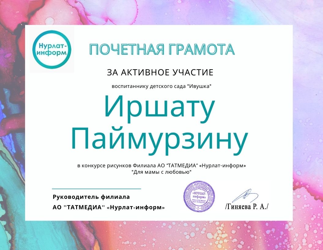 Диплом в творческом конкурсе филиала АО "Татмедиа" "Нурлат-Информ" Есения К.