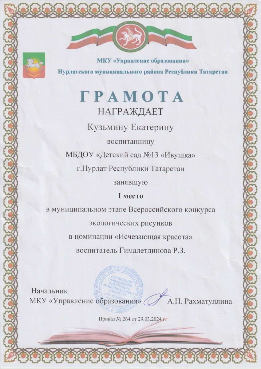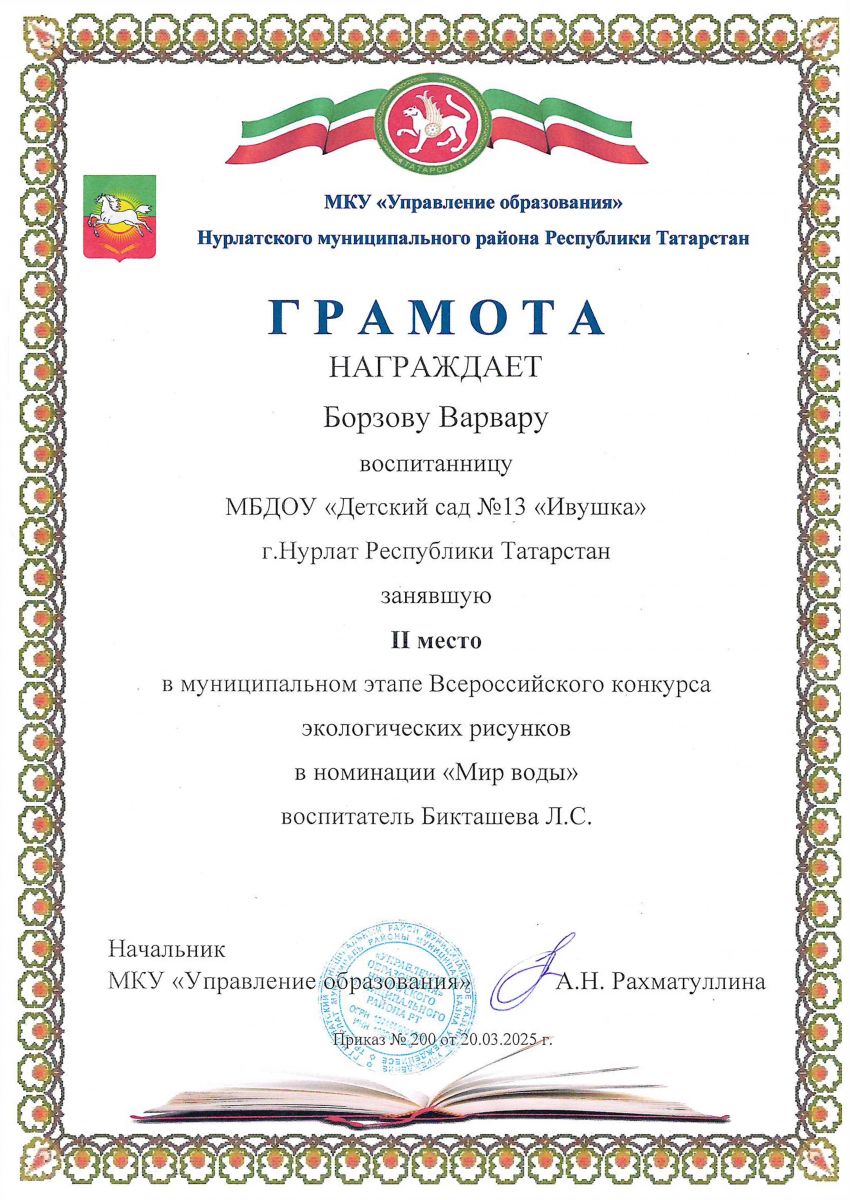 Грамота 2 место в муниципальном конкуросе экологических рисунков Борзова Варвара