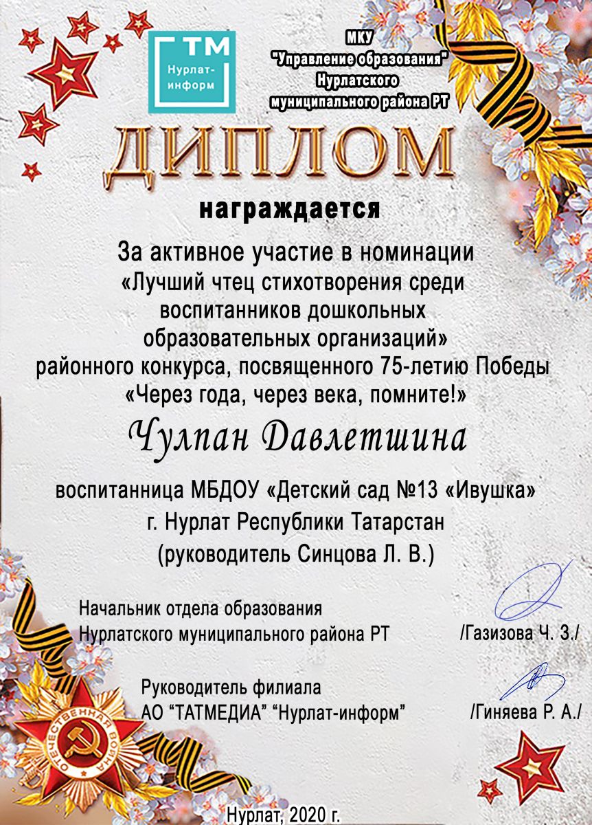 Диплом. Конкурс чтецов "Через года, через века, помните!" Давлетшина Чулпан