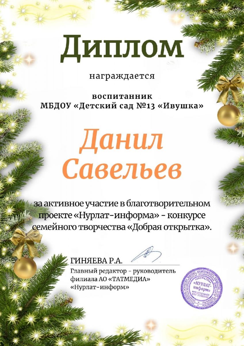 Диплом за активное участие в конкурсе семейного творчества "Добрая открытка" Данил С