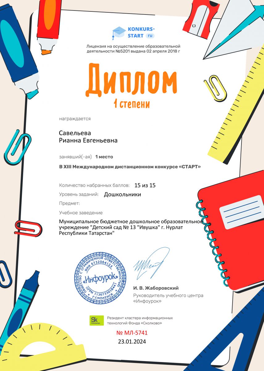 Диплом 1 степени в XIII Международном дистанционном конкурсе "Старт " Радэль Ф.