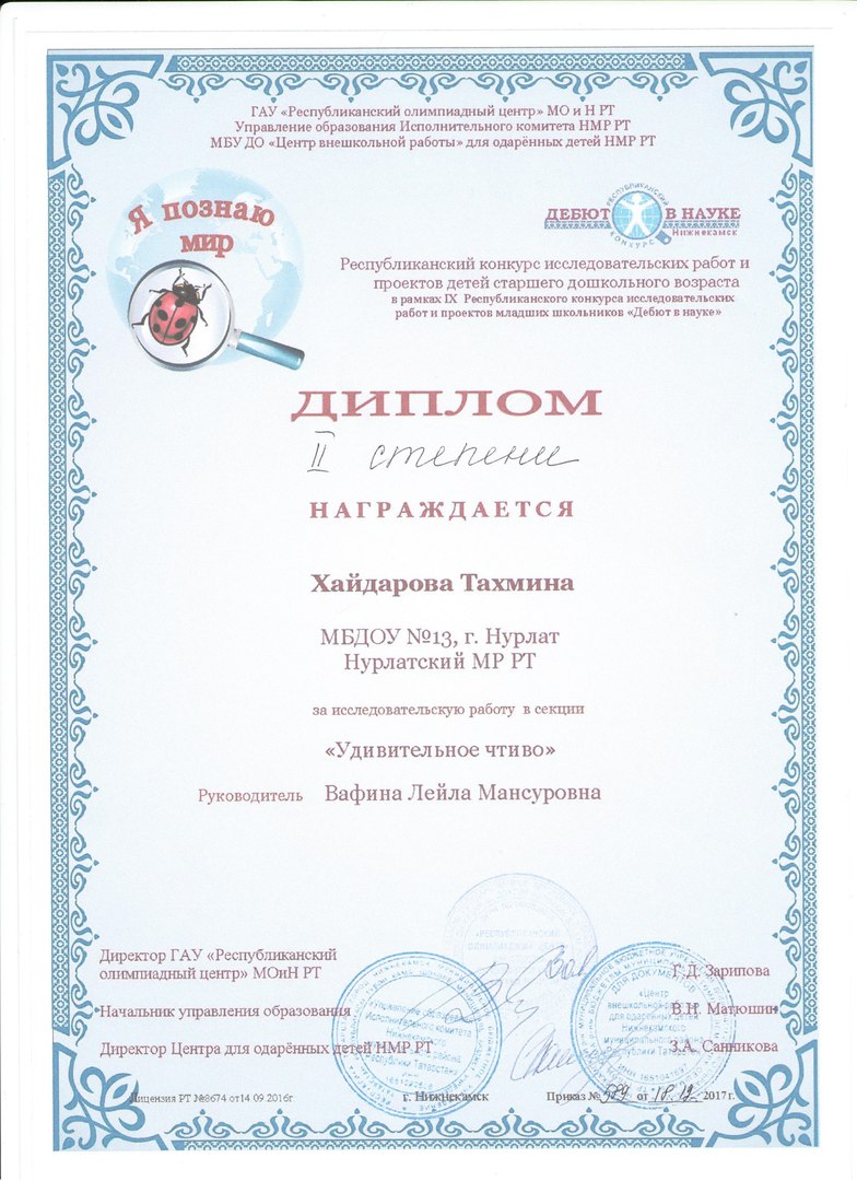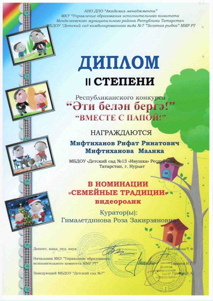 Диплом 2 степени Республиканского конкурса "Вместе с папой" Мифтиханова Малика