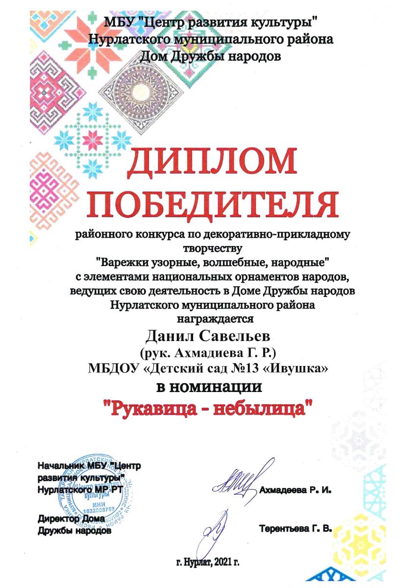 Диплом победителя районного конкурса по ДПТ "Варежки узорные, волшебные, народные" Данил С.