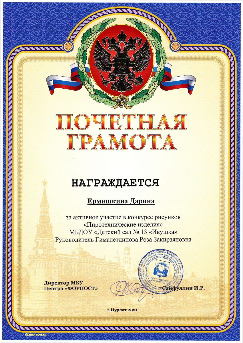 Грамота за активное участие. Дарина.Е. Конкурс рисунков "Пиротехнические изделия"