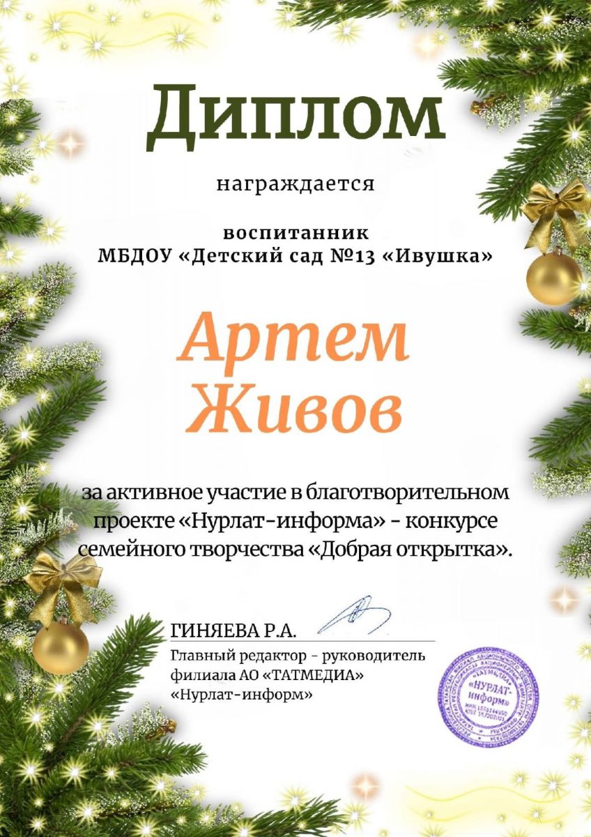 Диплом за активное участие в конкурсе семейного творчества "Добрая открытка" Артём Ж.