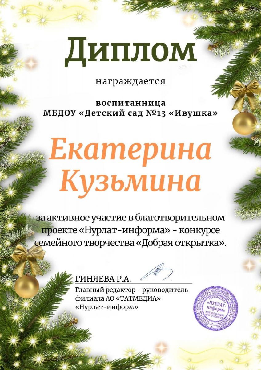 Диплом за активное участие в конкурсе семейного творчества "Добрая открытка" Екатерина К.