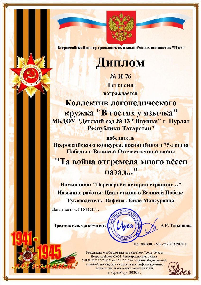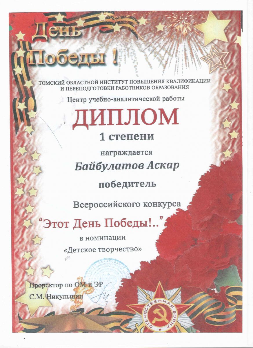 Диплом 1 степени во всероссийском конкурсе "Этот День Победы" (Байбулатов Аскар)