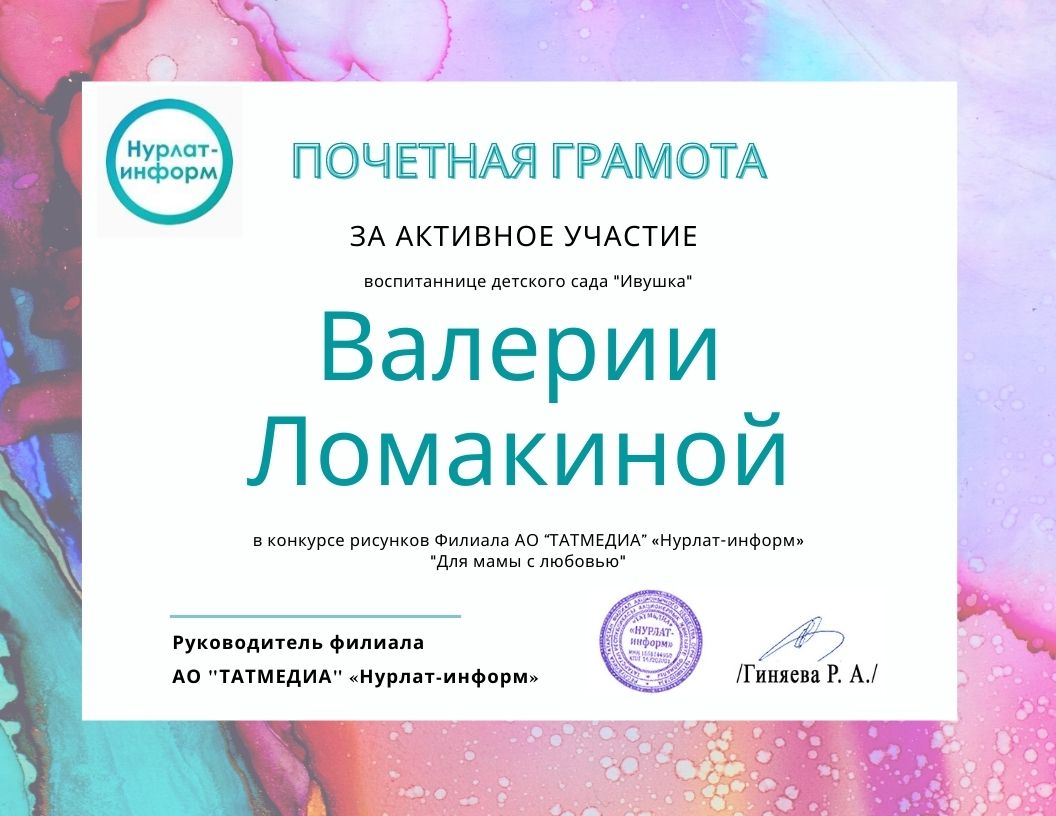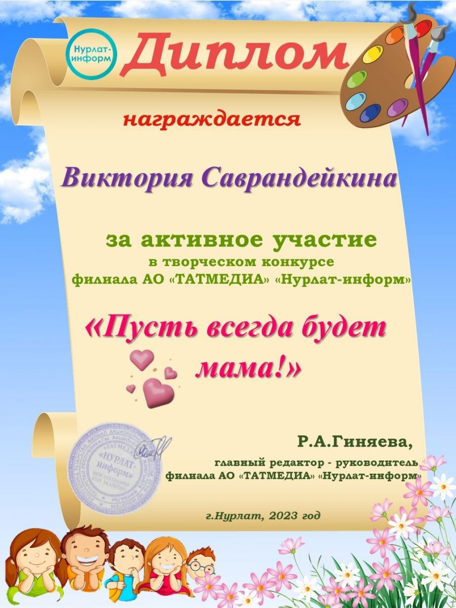 Диплом в творческом конкурсе филиала АО "Татмедиа" "Нурлат-Информ" Виктория С.