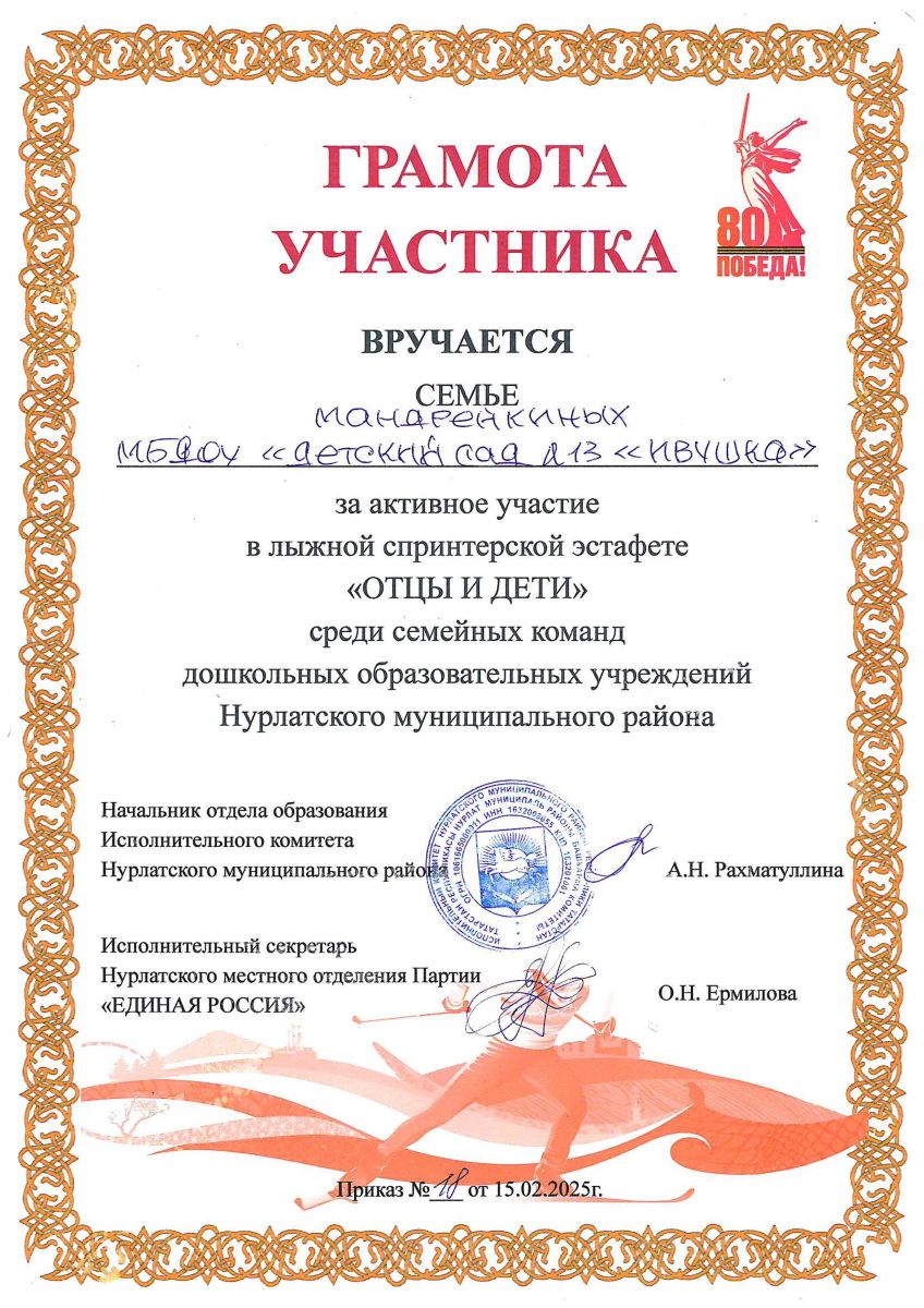 Грамота семье Мандрейкиных в лыжной спринтерской эстафете "Отцы и дети"
