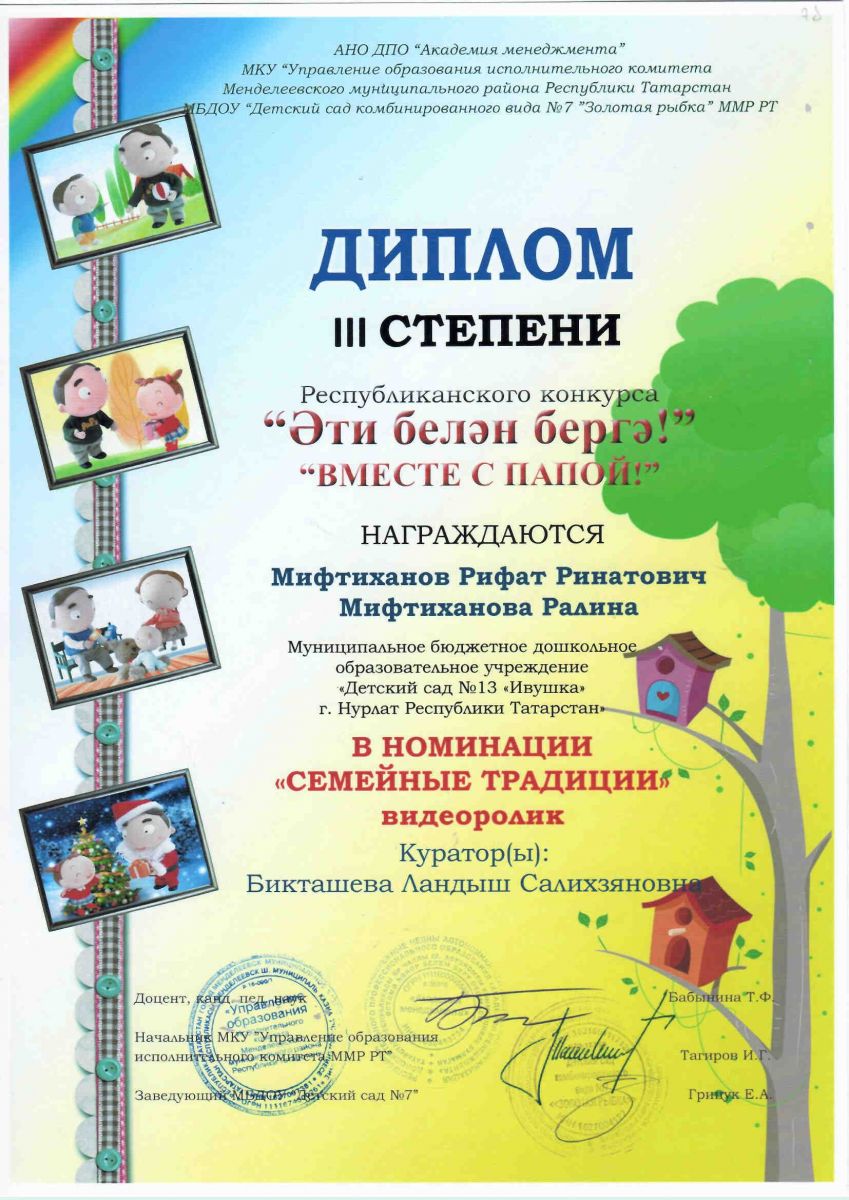 Диплом 3 степени Республиканского конкурса "Вместе с папой" Мифтиханова Ралина