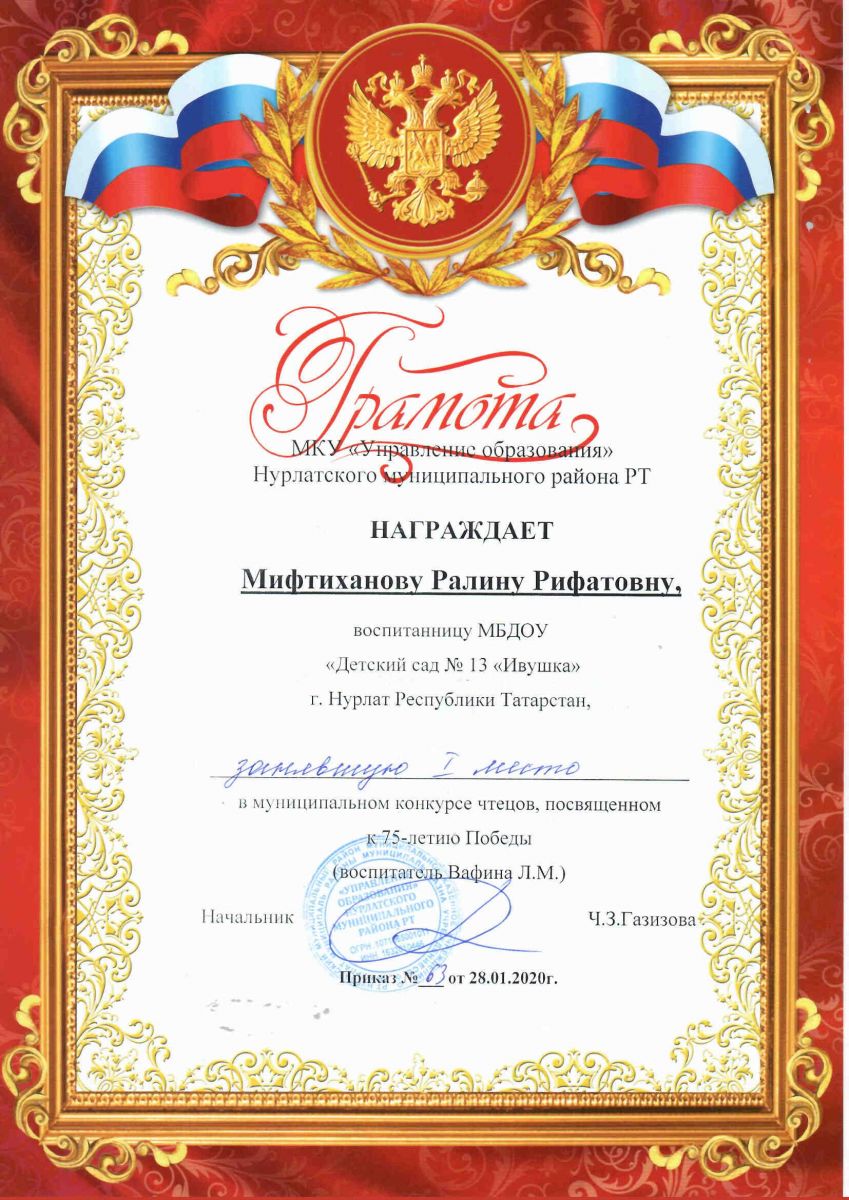 Грамота 1 место Мифтиханова Ралина, Муниципальный конкурс чтецов