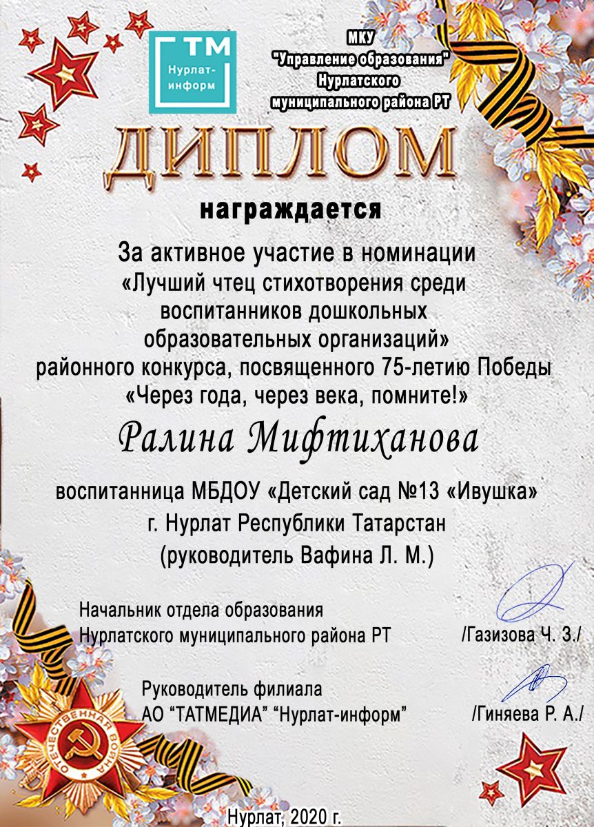 Диплом. Конкурс чтецов "Через года, через века, помните!" Мифтиханова Ралиина