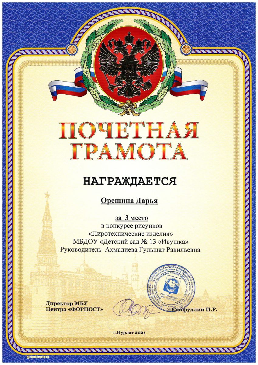 Грамота 3 место. О.Дарья. Конкурс рисунков "Пиротехнические изделия"
