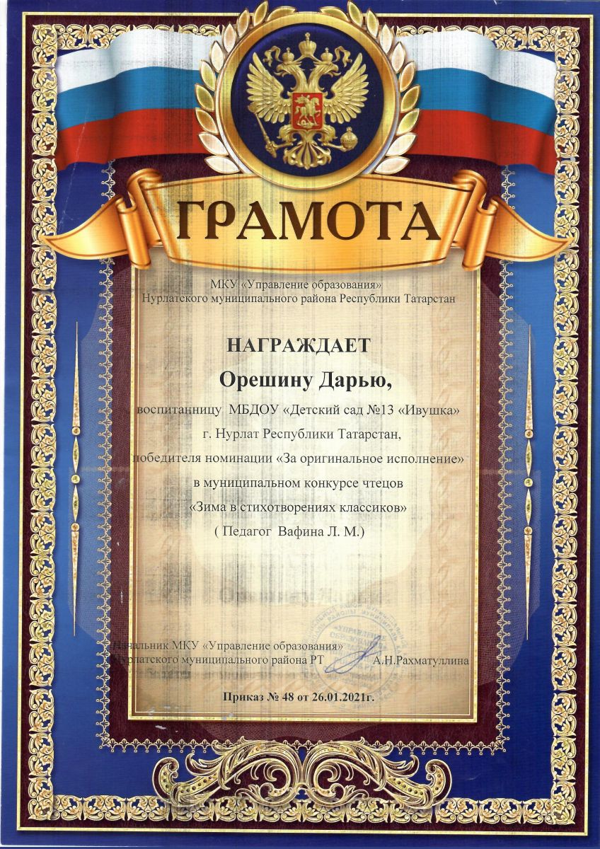 Грамота (О.Дарья) в муниципальном конкурсе чтецов "Зима в стихотворениях классиков"